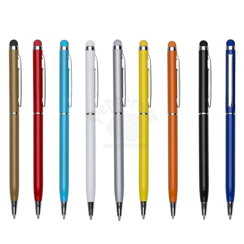 Caneta de metal com ponteira touch personalizada, possui clip de metal, esferográfica na cor azul com acionamento por giro e ponteira touch para uso em tablets e smartphones.