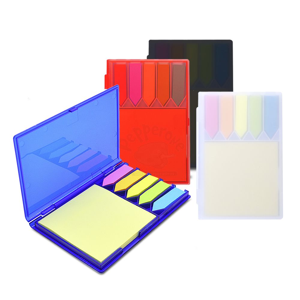 Bloco de anotações produzido em PVC translúcido, possui tampa translúcida em acrílico, 1 bloco para recados amarelo e 5 blocos de autocolantes coloridos reposicionáveis.