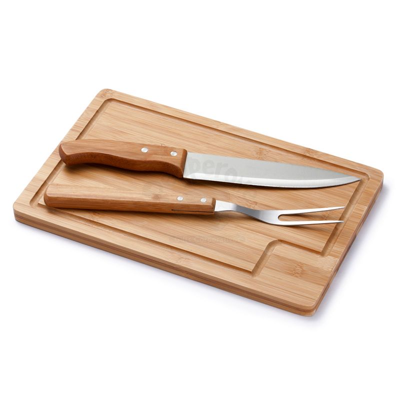 Kit churrasco com 3 peças, faca, garfo e tábua para corte antibacteriano para dar maior durabilidade. Gravação a Laser em todas as peças