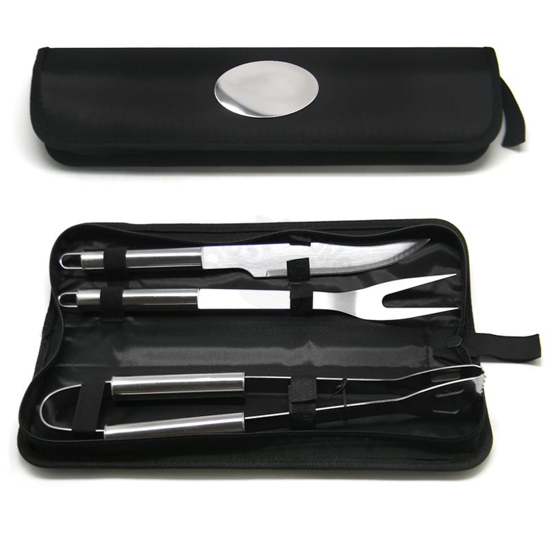 Kit churrasco com 3 peças em Inox, estojo em nylon resistente, com placa de metal para gravação.