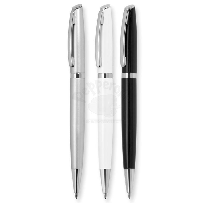 Promocional Caneta de metal esferográfica resistente, acionamento por giro com detalhe em prata e escrita macia. Consultar as cores. Gravação laser