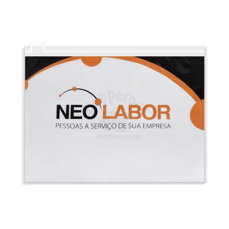 Pasta confeccionada em PVC Cristal com fecho ZIP ZAP. Impressão de logotipo em silkscreen.
