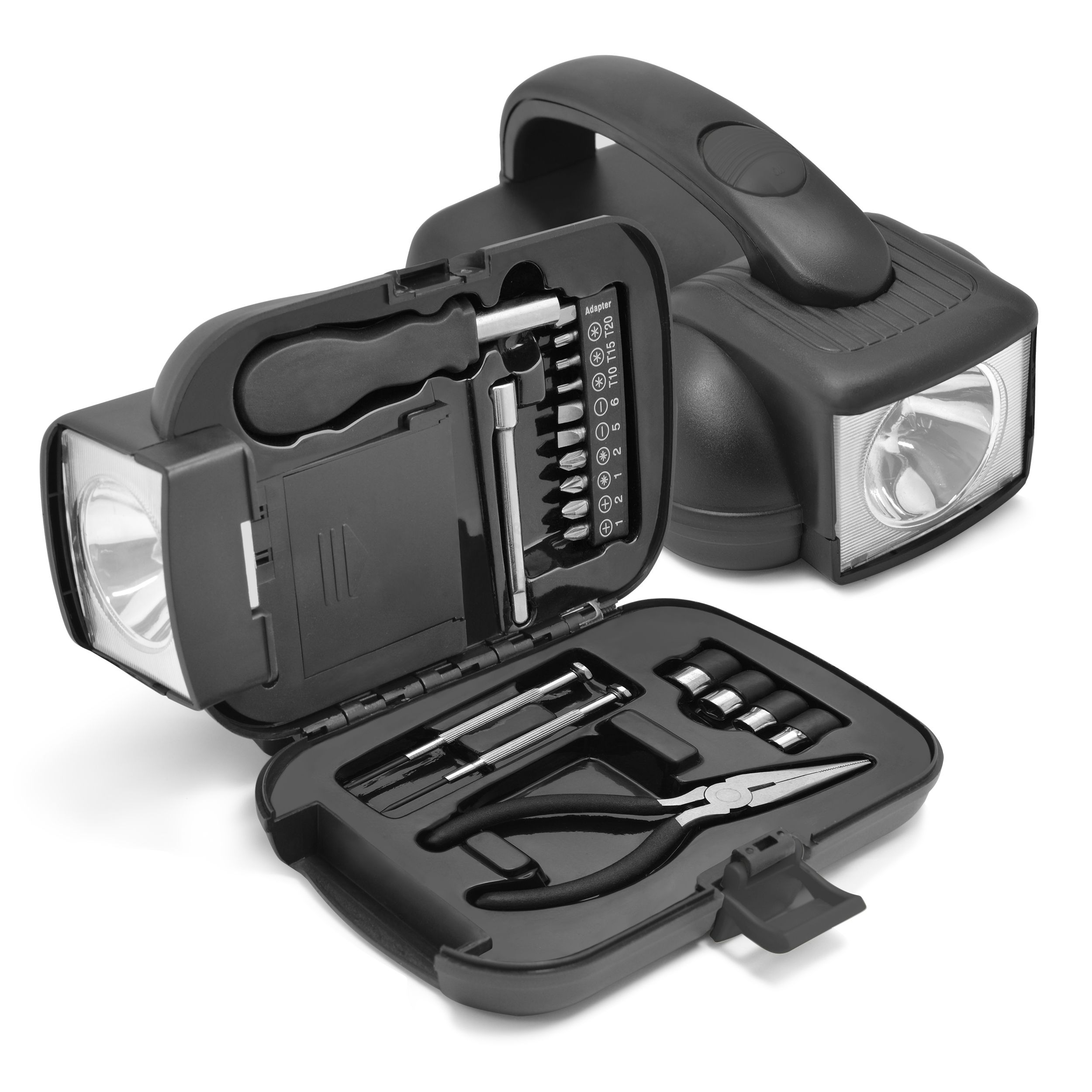 Caixa de ferramenta para personalizar com 19 peças, levando ao seu dia a dia mais desempenho, durabilidade e segurança ao fazer reparos e consertos domésticos. Contém: * 1 Lanterna * 1 Alicate de bico * 1 Jogo de chaves de boca (5, 6, 8, 10mm) * 1 Chave canhão com extensor para chave de boca * 1 Jogo de pontas com 9 unidades * 1 Chave de precisão fenda * 1 Chave de precisão philips. Acondicionada em embalagem duplex.