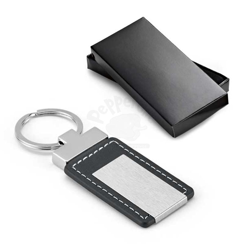 Chaveiro de metal e couro sintético para dar de presente. Acondicionado em embalagem preta.