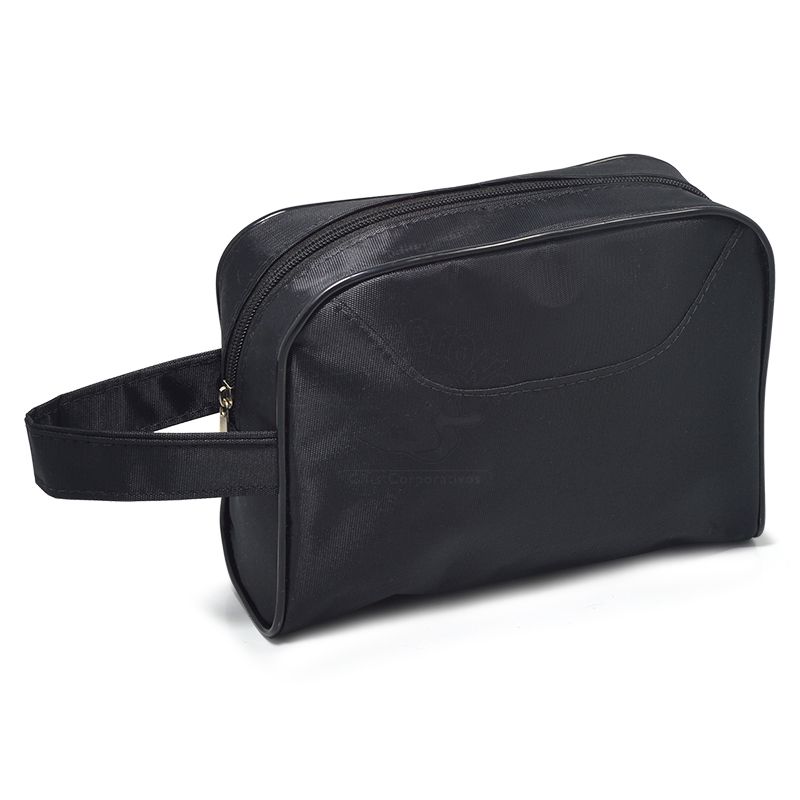 Necessaire para promocionais. Confeccionada em Nylon, possui alça de mão e compartimento único para acomodar acessórios de higiene pessoal.