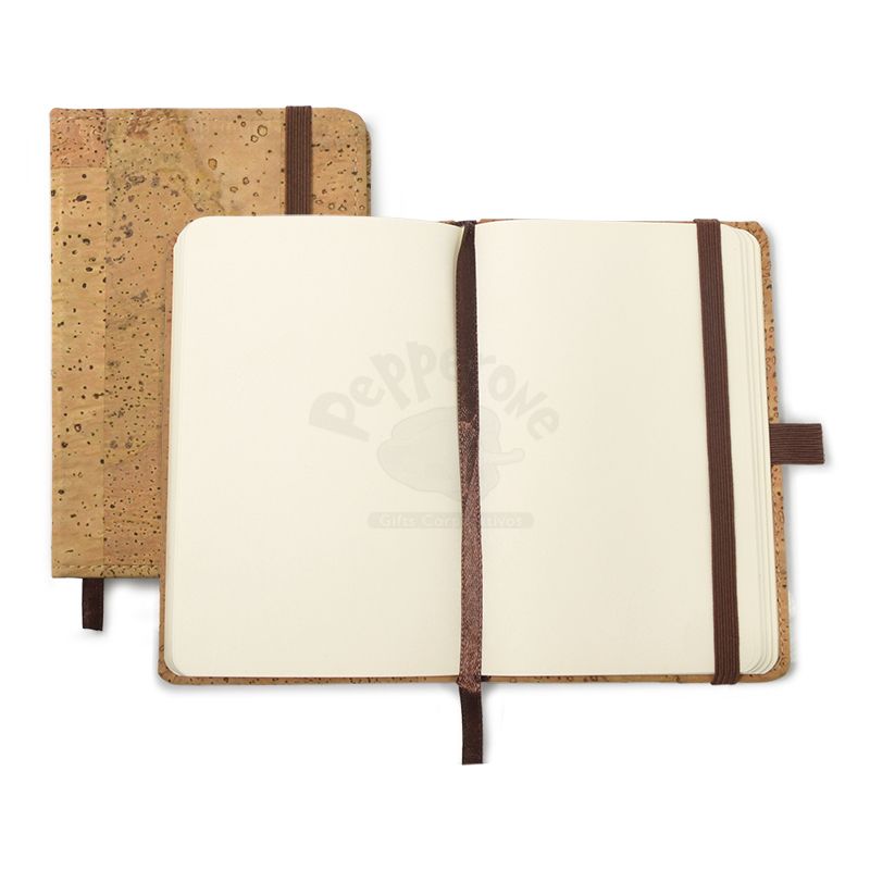 Bloco de anotações produzido em cortiça, possui porta caneta, separador de página, elástico de fechamento e 80 folhas não pautadas na cor marfim.