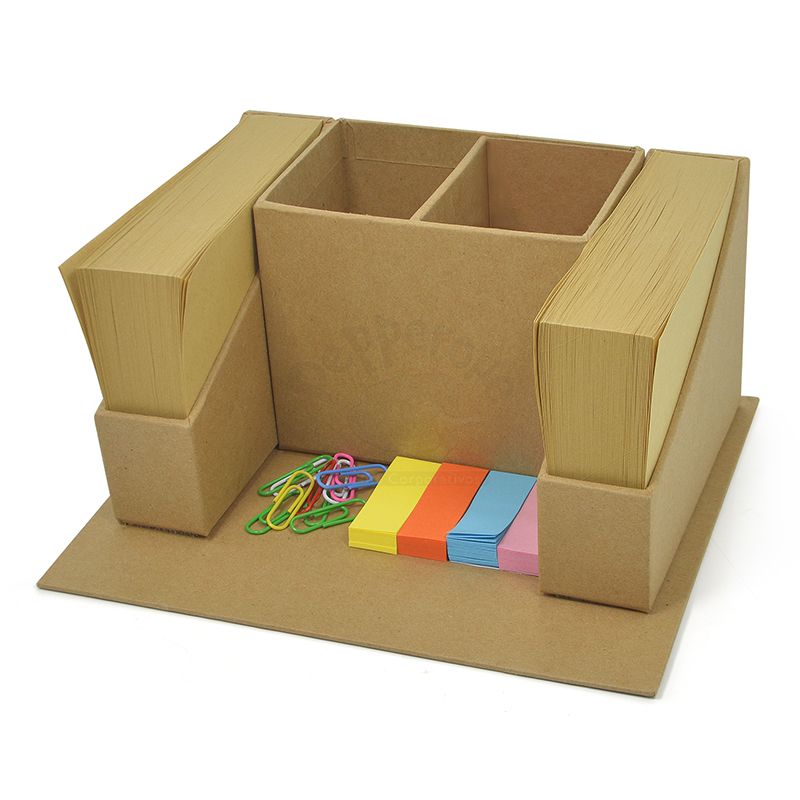 Bloco de mesa possui 2 blocos de papel kraft com aproximadamente 250 folhas cada, 1 pacote de clips coloridos e 4 blocos de marcadores de páginas.
