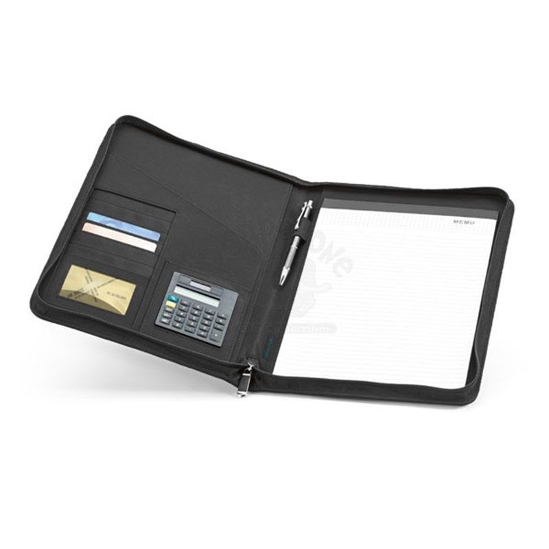 Confeccionada em microfibra, possui calculadora dual-power de 8 dígitos. Incluso pilha. Bloco: 20 folhas pautadas. Esferográfica não inclusa. Chapa de metal: 4,5 x 1,5 cm