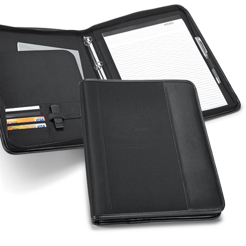 Confeccionada em couro sintético e microfibra, com 4 argolas de 20mm para folhas A4. Bloco:20 folhas pautadas. Caneta e pen drive não incluso.