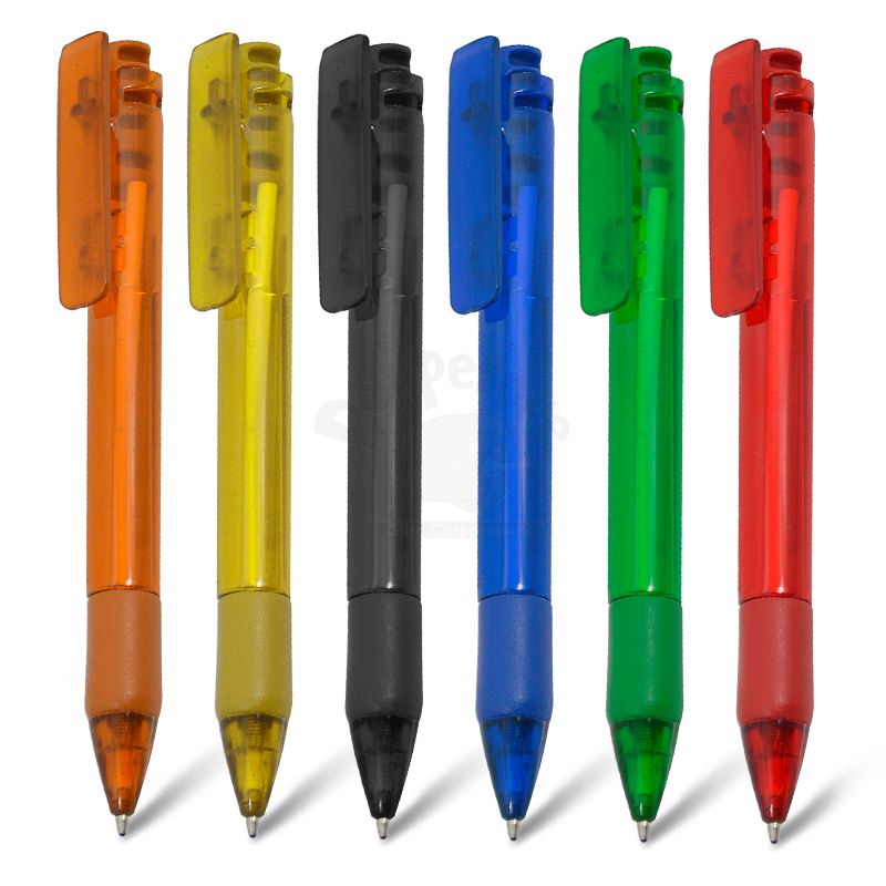 Confeccionada em material plástico, possui ponteira esferográfica com carga azul, acionamento por click.