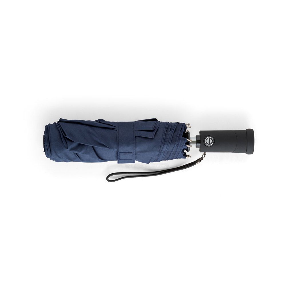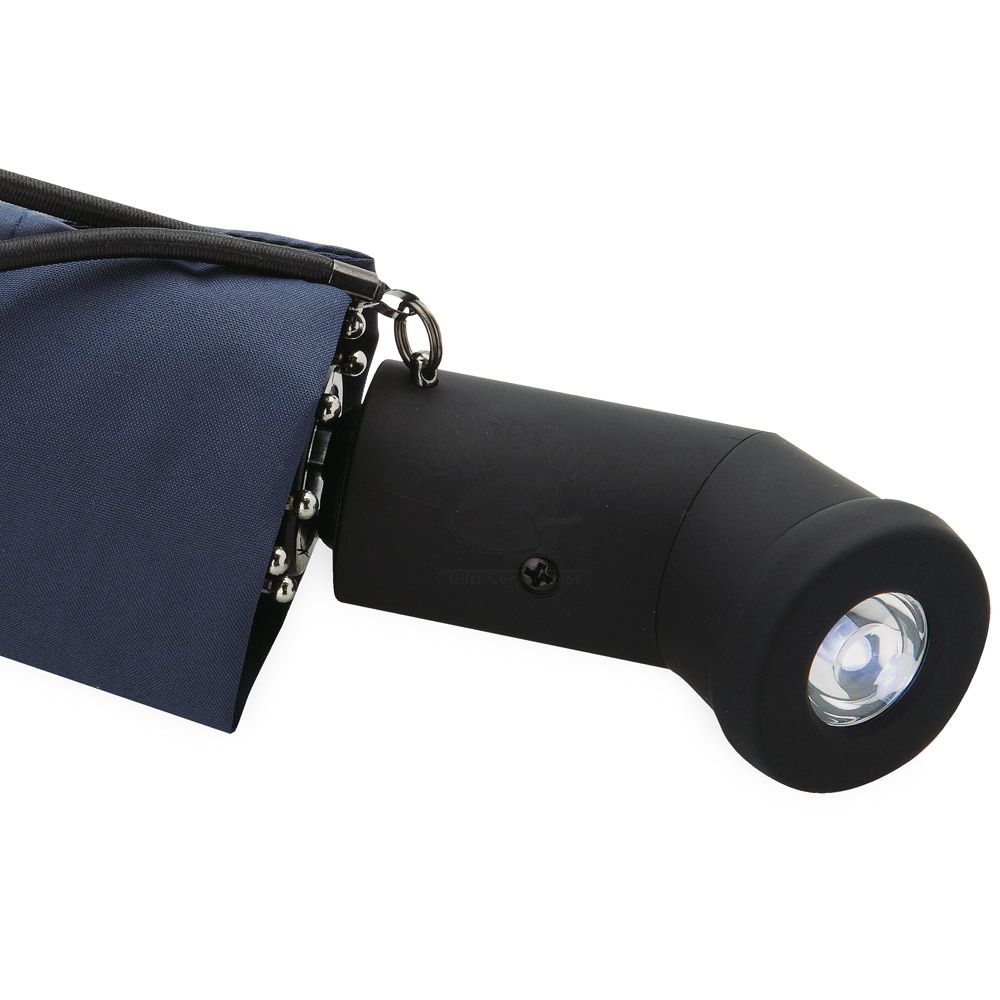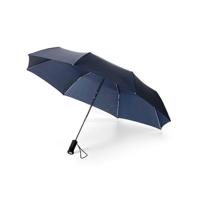 Guarda-Chuva dobrável em Poliéster em 3 secções com lanterna na pega (pilhas inclusas). Fornecido em bolsa. ø94cm largura aberto.