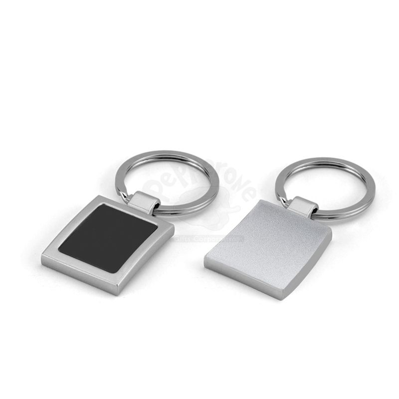 Chaveiro de metal com placa central personalizada preta, argola para chaves e acabamento fosco metalizado no verso do chaveiro. Acompanha embalagem em caixinha preta.