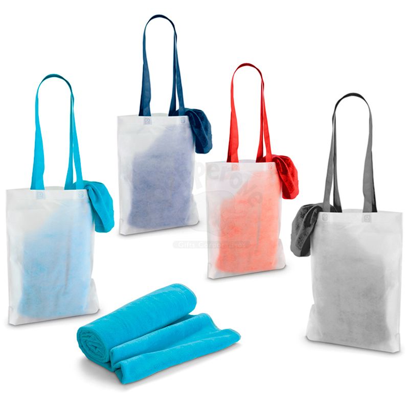 Toalha de praia em veludo de algodão 320 g/m², acompanha de sacola em non-woven (80 g/m²) com alças de 75cm.
