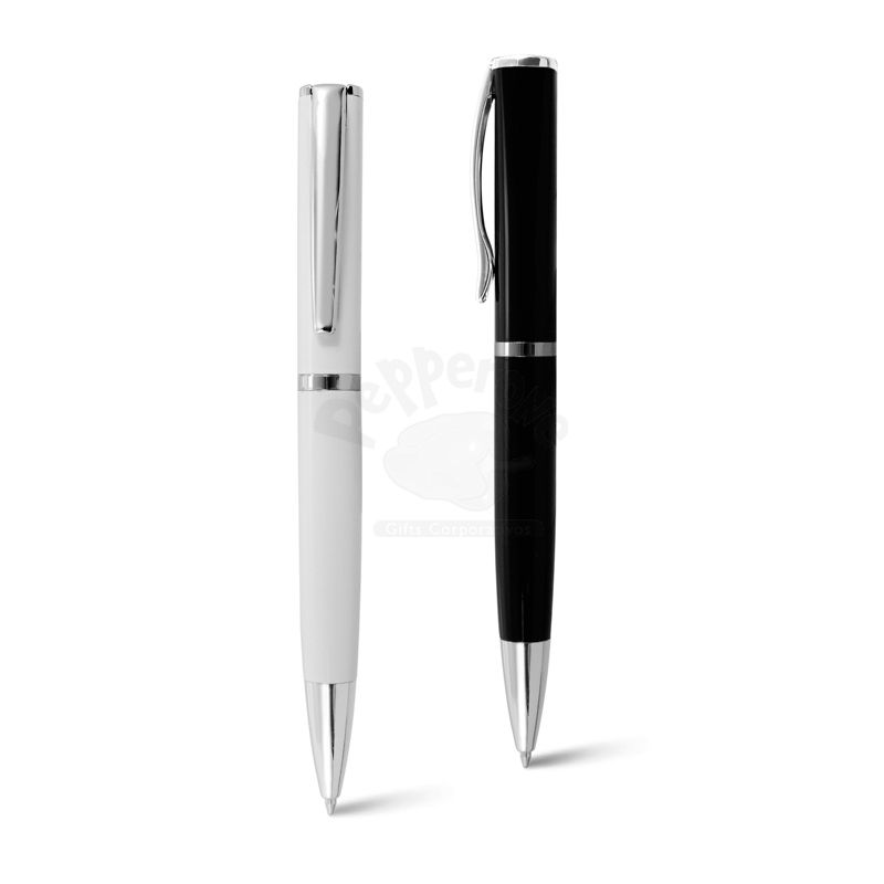 Caneta de metal com esferográfica azul e clip personalizado. Possui um escrita macia e confortável para uso no dia a dia.