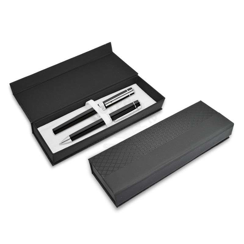 Estojo personalizado para duas canetas, possui acabamento texturizado e interior almofadado em veludo branco. Ideal para brindes promocionais e eventos corporativos. *Obs.:Canetas não inclusas ao produto.