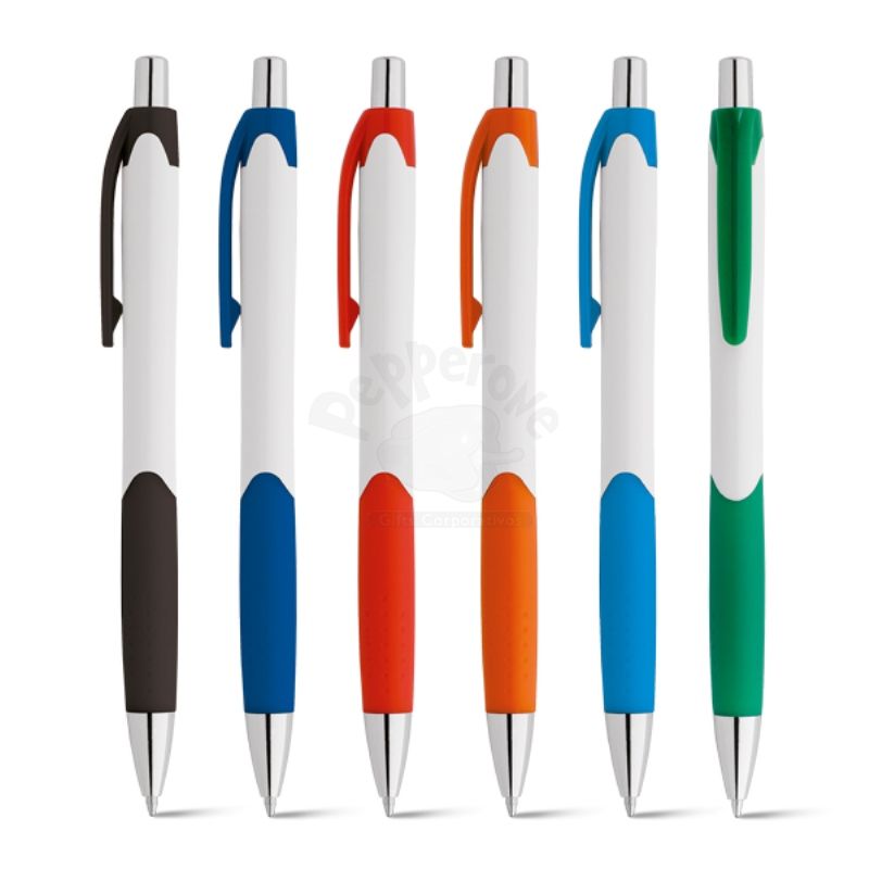 Produzida em ABS com detalhe emborrachado que assegura uma escrita macia e confortável, e esferográfica na cor azul que é exibida e recolhida através do mecanismo do click.