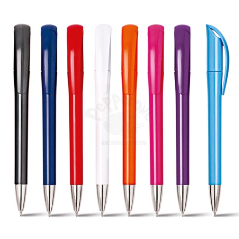 Caneta plástica personalizada produzida em ABS, esferográfica na cor azul que é exibida e recolhida através do mecanismo do click em um design inovador com acabamento brilhoso.