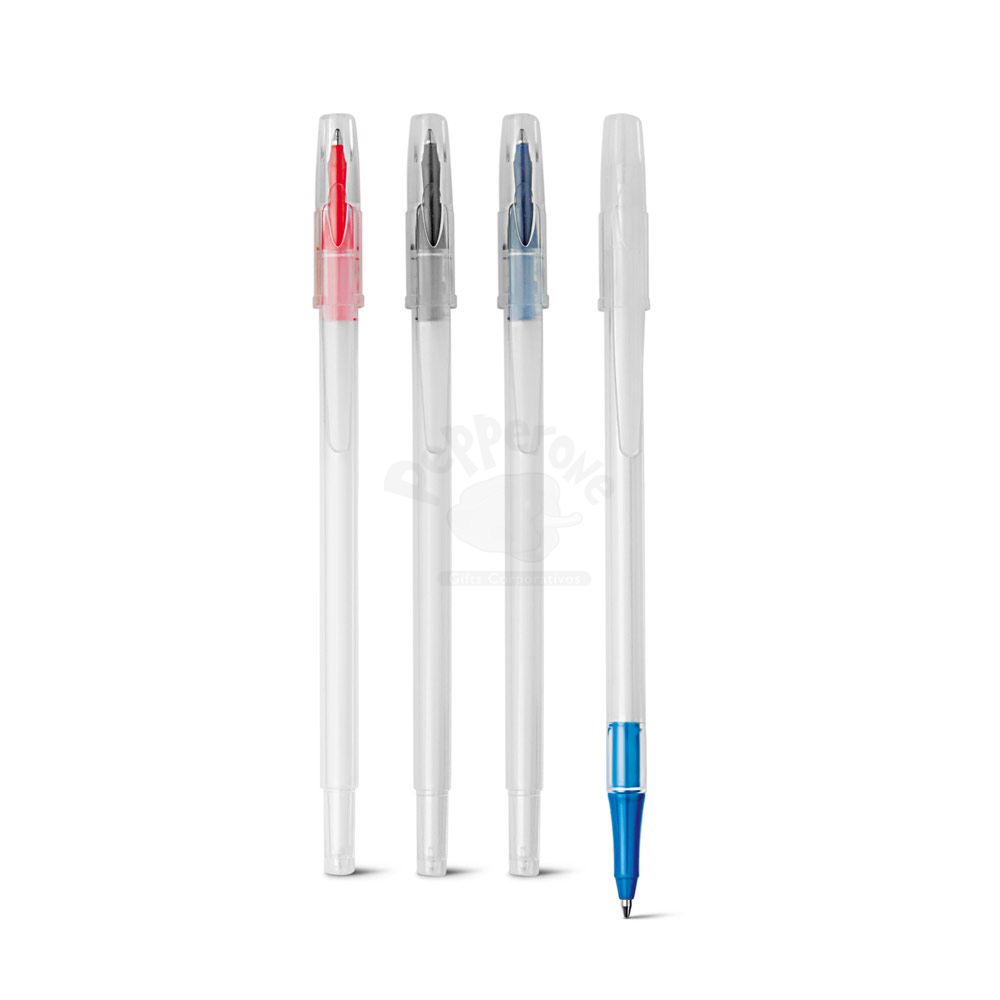 Caneta plástica produzida com acabamento translúcido, possui esferográfica na cor azul com tampa e clip personalizado. Ideal para eventos corporativos e brindes promocionais.