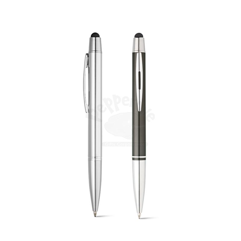 Esferográfica com escrita azul e ponteira touch que proporciona o uso em seu tablet e smartphone. Possui acabamento brilhoso elegantes ideal para eventos corporativos e brindes promocionais.