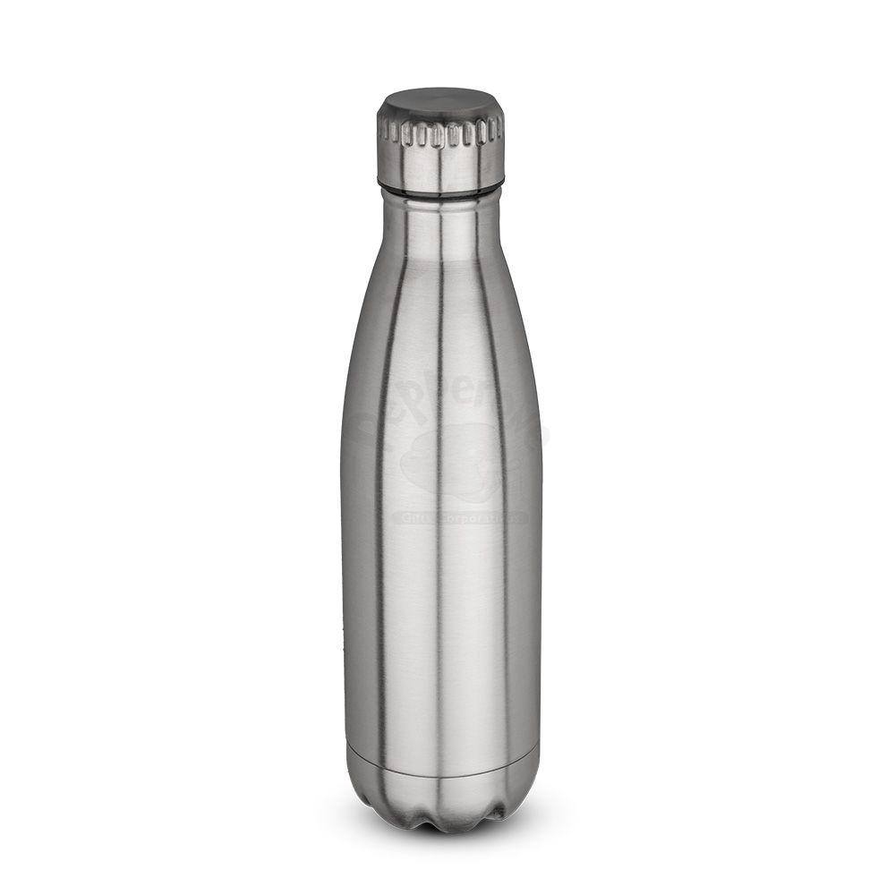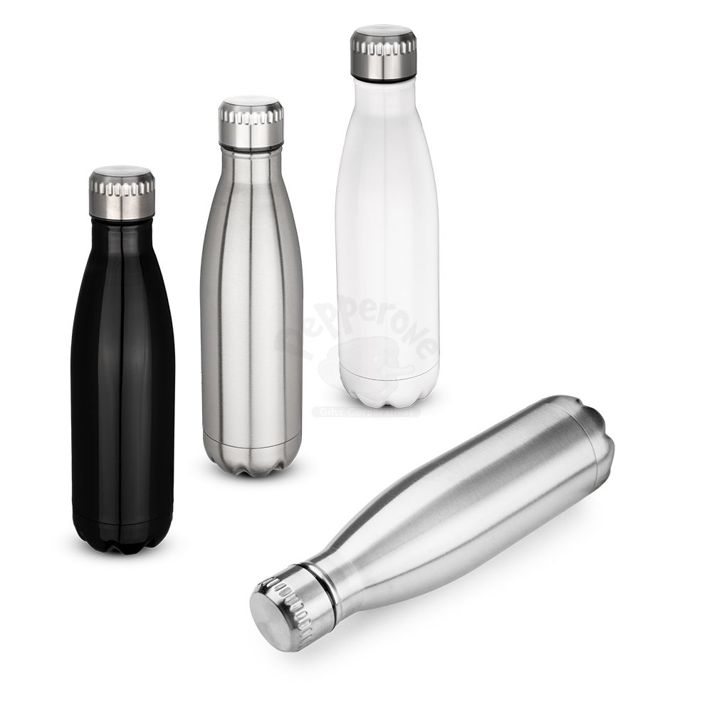 Garrafa em aço inox 304 com capacidade de até 700 ml. Tampa rosqueável e anel de silicone para vedação. Design com frisos na tampa.
