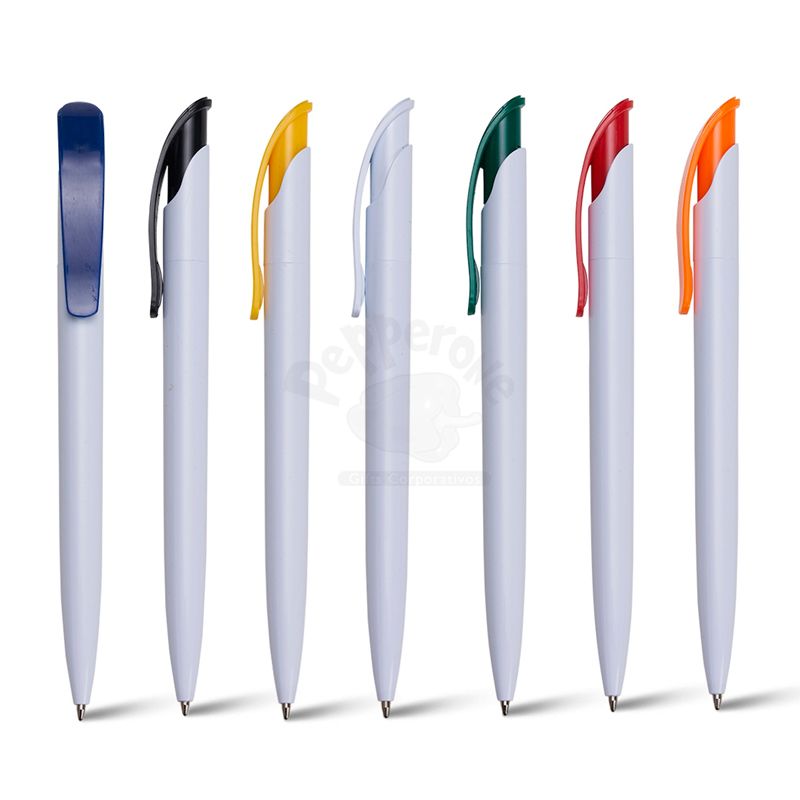 Caneta plástica personalizada com clip curvado em um design moderno e inovador, possui esferográfica azul e acionamento da ponteira por click.