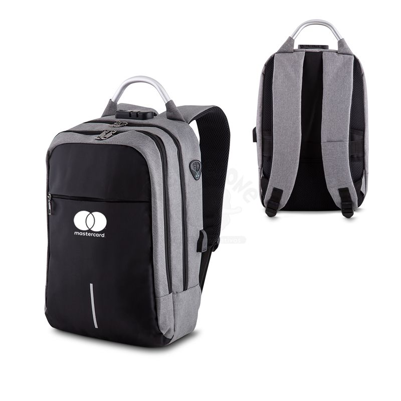 Mochila para notebook personalizada com saída USB e fone de ouvido. Possui fechamento em cadeado com segredo, alça de mão em metal, alças ajustáveis e almofadadas, fita reflexiva, 1 bolso frontal grande, divisórias internas para canetas, documentos, celular e notebook. Ideal para brindes personalizados e eventos corporativos.