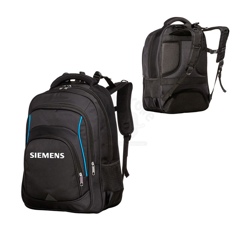 Mochila para notebook personalizada produzida em poliéster e detalhes em nylon. Possui amplo espaço interno para notebook até 15", bolsos menores com divisórias para documentos, 2 bolsos frontais, bolso lateral de telinha, alças de mão com espuma, alças para costa ajustável, alça horizontal para encaixe em malas de viagem e parte traseira com revestimento anti-transpirante. Objetos decorativos não acompanha o produto. Ideal para brindes personalizados e eventos corporativos.