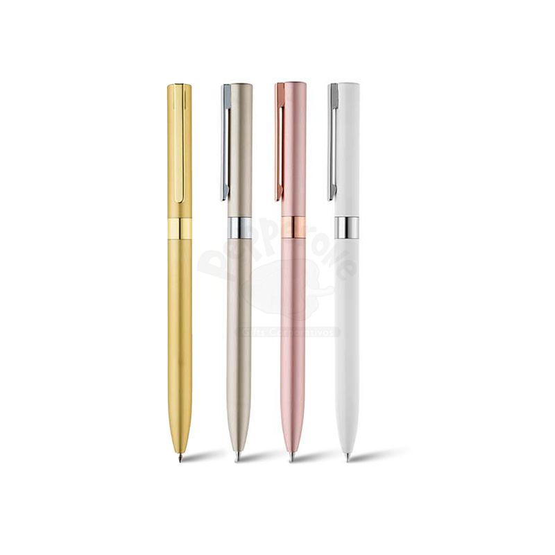 Caneta de metal personalizada com detalhes no corpo, possui acionamento da escrita giratório na parte superior da caneta e esferográfica na cor preta com uma escrita macia e confortável. Ideal para divulgar sua empresa em eventos corporativos, brindes personalizados e campanhas promocionais.