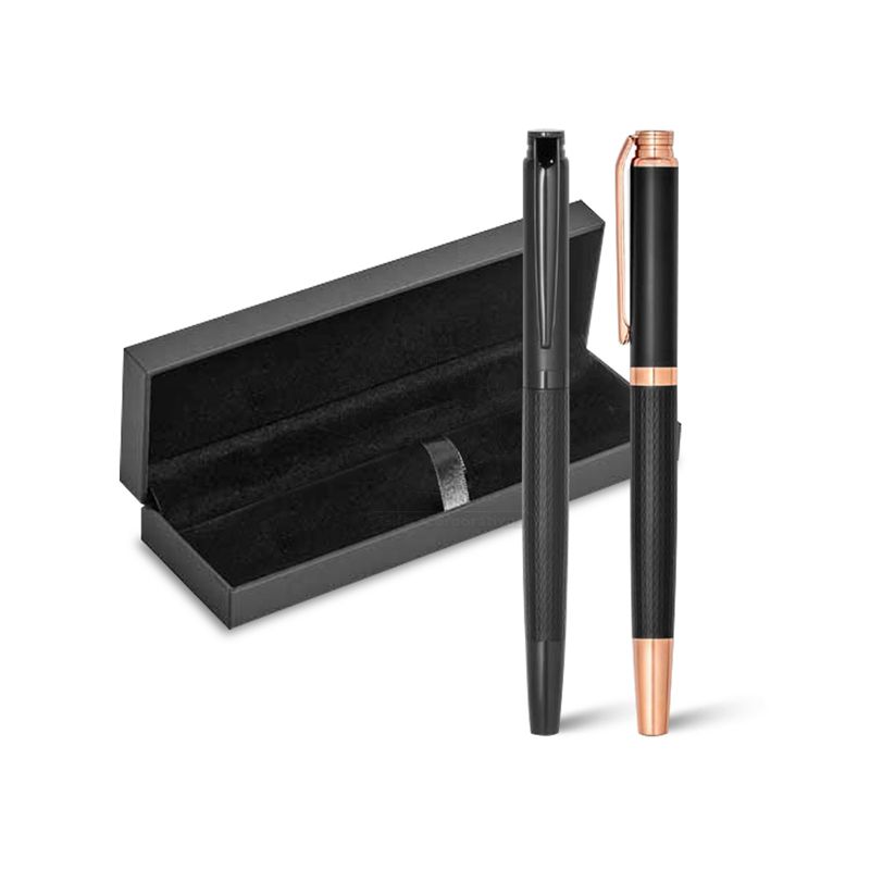 Caneta personalizada produzido em metal com detalhe texturizado no corpo da caneta. Possui escrita preta, clip de metal e tampa destacável. Acompanha 1 estojo com acabamento interno em veludo e almofadado. Ideal para divulgar sua empresa em eventos corporativos, brindes personalizados e campanhas promocionais.