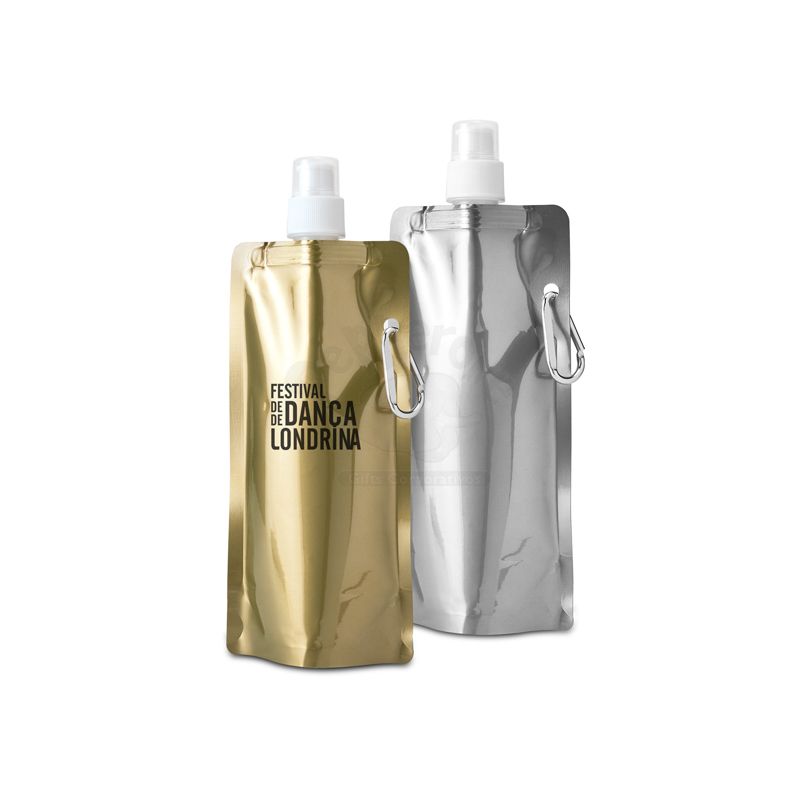 Squeeze dobrável personalizado produzido em plástico PE e acabamento brilhoso com capacidade de 460ml, possui tampa protetora, bico de fechamento e mosquetão de alumínio lateral. Ideal para divulgar sua empresa em eventos corporativos, brindes personalizados e campanhas promocionais.