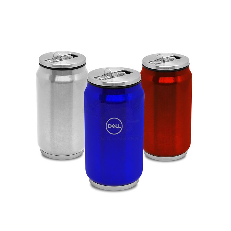 Squeeze em formato de lata com capacidade de 300ml, possui bico retrátil atóxico e tampa rosqueável com anel de vedação que impede o vazamento da bebida.