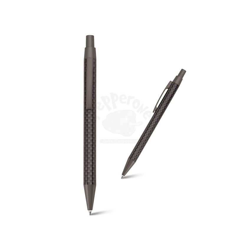 Caneta de metal personalizada com textura quadriculada em todo corpo da caneta, possui acionamento por click e escrita na cor azul. Ideal para brindes personalizados e eventos corporativos.