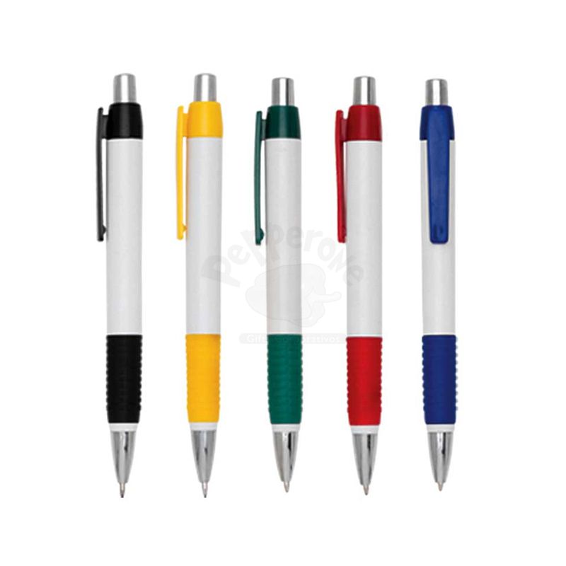 Promocional Caneta de Plástico com click injetada com corpo branco e detalhe emborrachado coloridos. Consultar as cores
