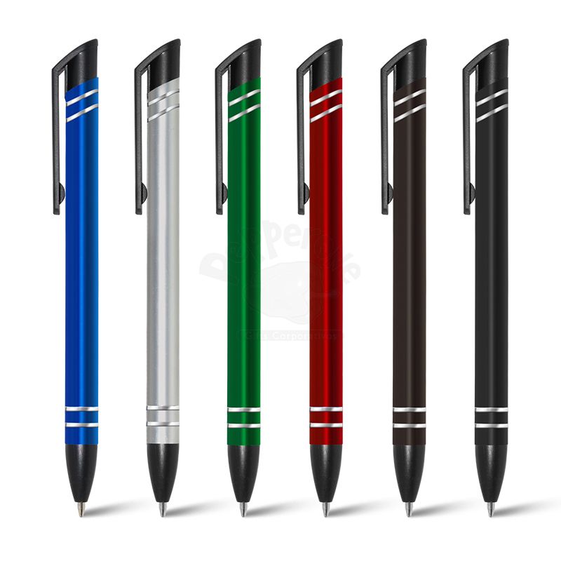 Caneta de metal personalizada com design inovador, possui detlahes em anéis prateados, clip em ABS corpo com acabamento brilhante e esferográfica azul com acionamento por click. Ideal para divulgar sua marca em brindes promocionais e eventos corporativos.