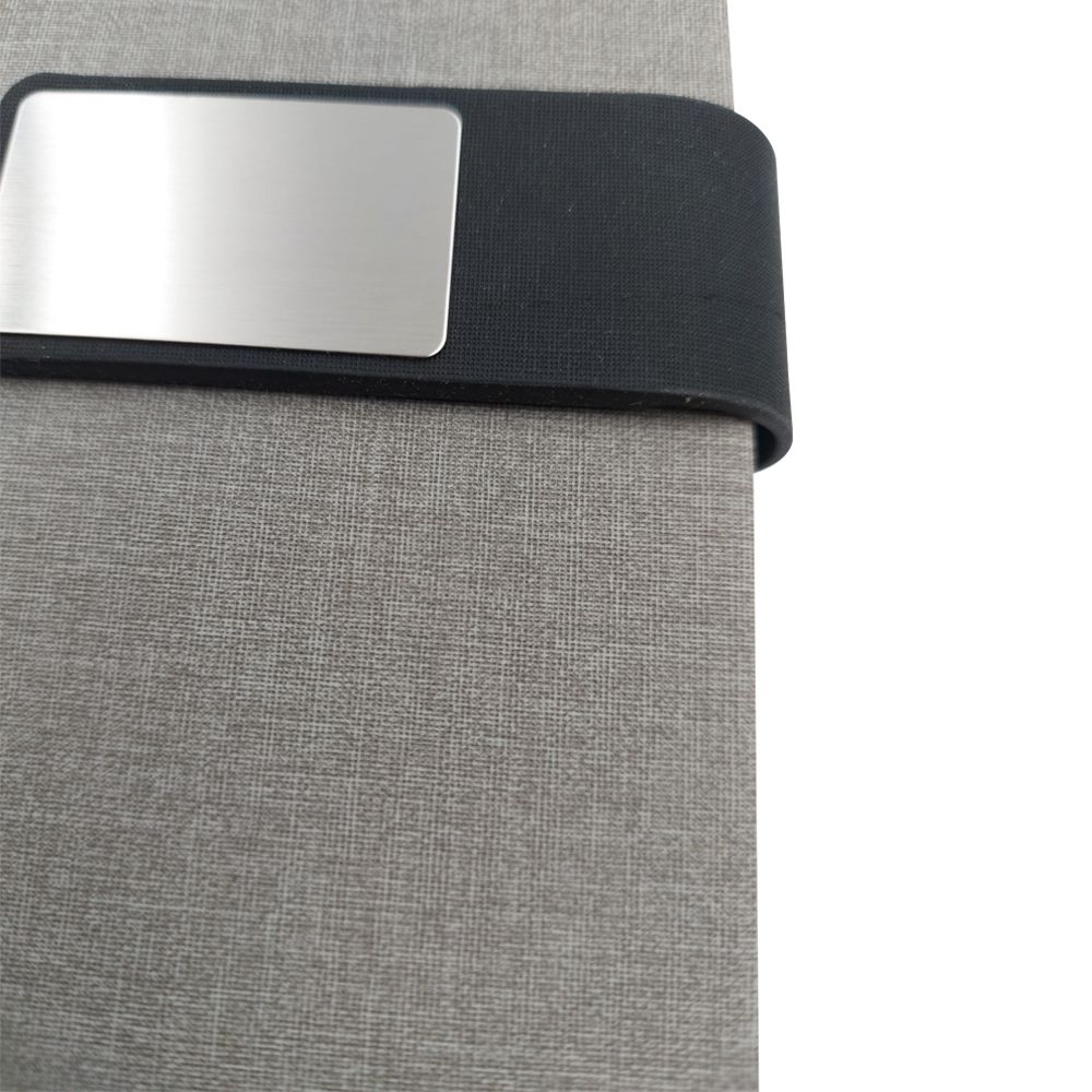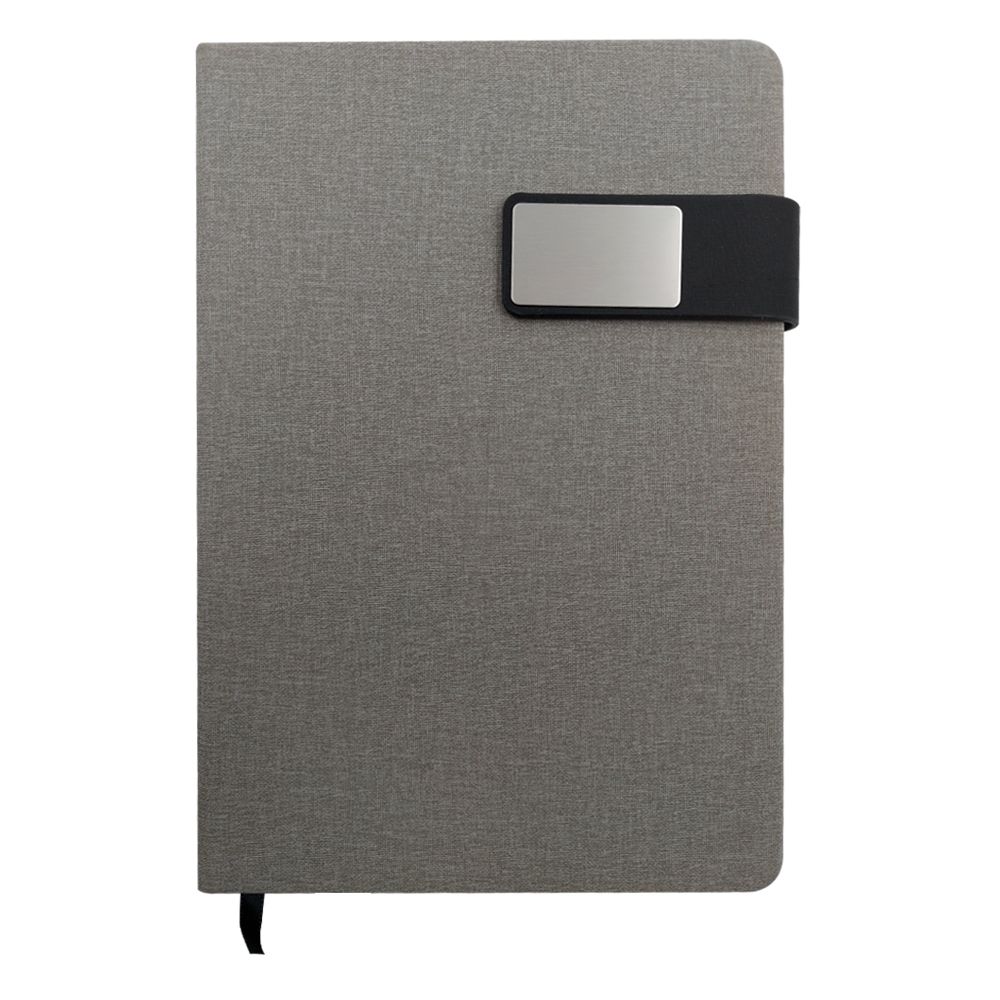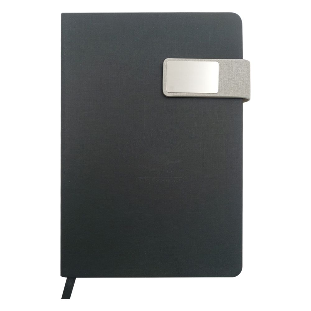 Bloco de anotações capa dura, revestida em tecido, com fecho magnético, 96 folhas amarela clara, pautada, marca página de cetim na cor preta. Ideal para divulgar sua empresa em eventos corporativos, brindes personalizados e campanhas promocionais.
