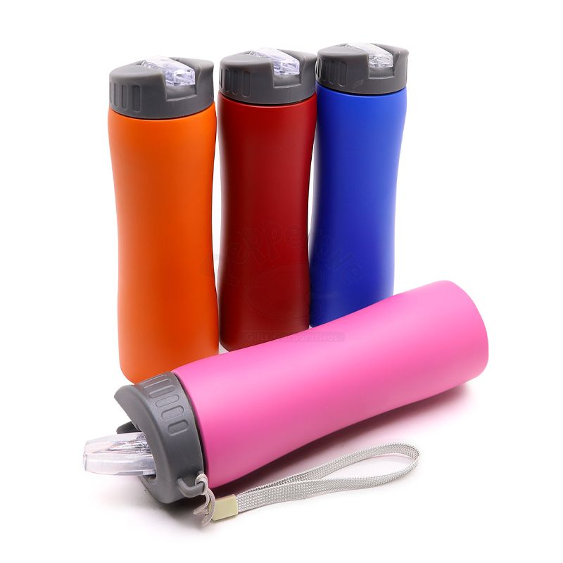Squeeze de metal personalizado produzido em aço inox com acabamento colorido fosco, capacidade para 600ml. Possui tampa plástica rosqueável com bico transparente que é acionado manualmente e alça de nylon para transporte. Com um design slim e um formato ondulado, é perfeito para levar na academia e atividades físicas. Ideal para brindes em campanhas promocionais e eventos esportivos.