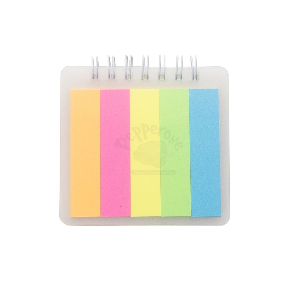 Bloco para anotações personalizado com capa plástica colorida translucida e espiral de metal branco. Possui 5 mini-blocos coloridos com aproximadamente 25 folhas cada um e bloco amarelo com aproximadamente 25 folhas. Ideal para brindes, campanhas promocionais e eventos corporativos.