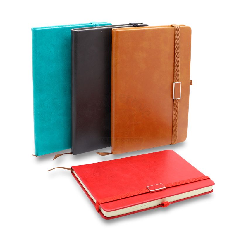 Bloco para anotações personalizado com capa dura em couro sintético. Possui fecho de elástico com detalhe de metal e marca páginas de nylon. Contém aproximadamente 96 folhas não pautadas na cor branca. Ideal para brindes campanhas promocionais e eventos corporativos.