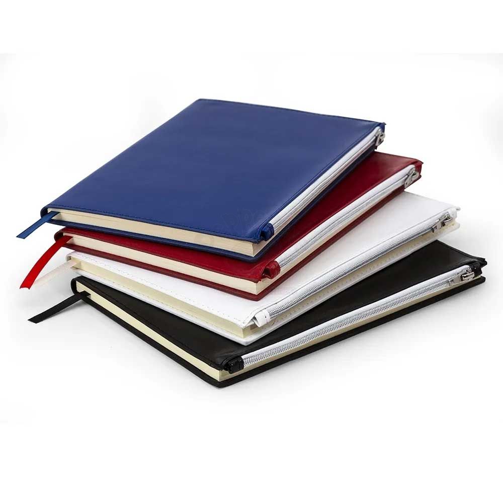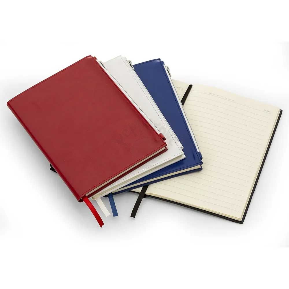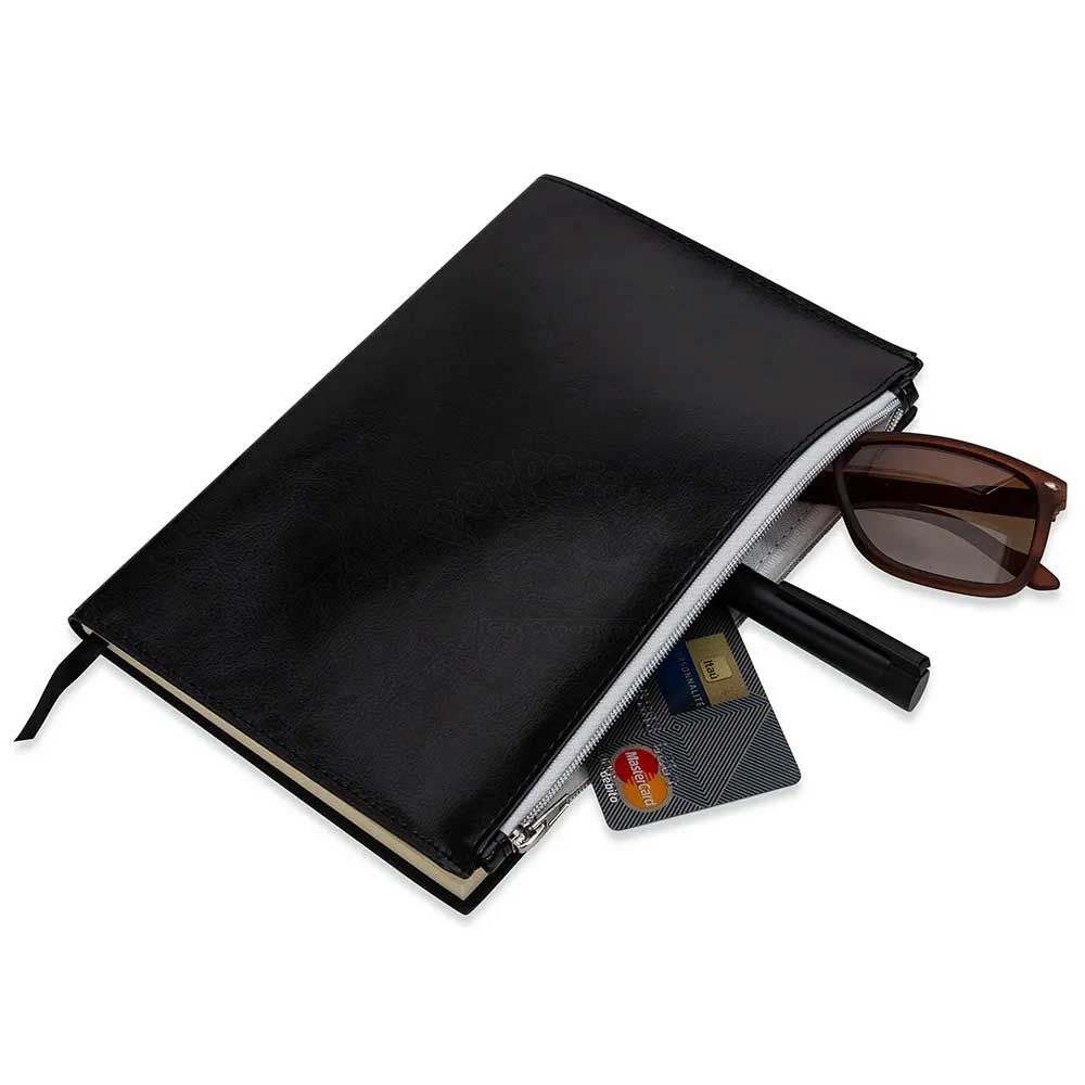 Bloco de anotações personalizado com 80 folhas pautadas, gramatura folha: 90gsm, formato A5, capa em material sintético (similar a couro) e Bolso frontal com zíper para guardar acessórios e objetos pessoais. Ideal para brindes promocionais e eventos corporativos.