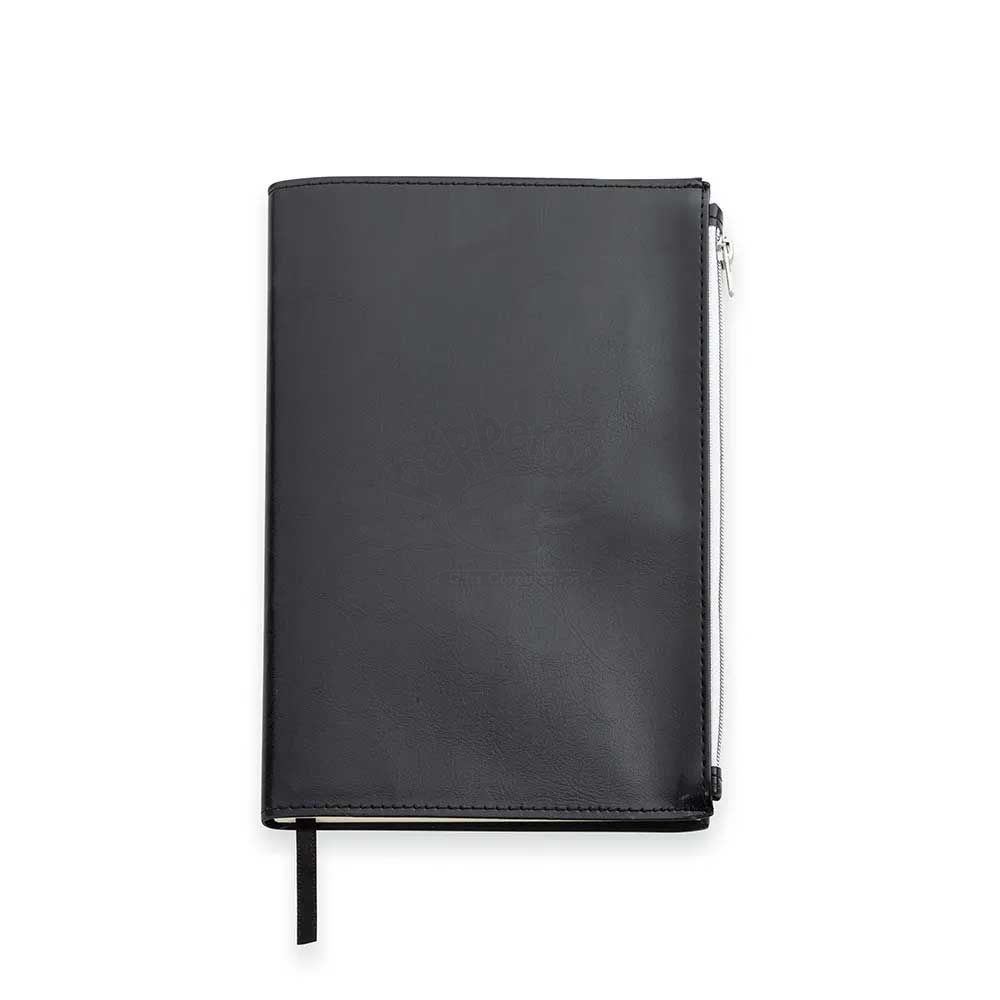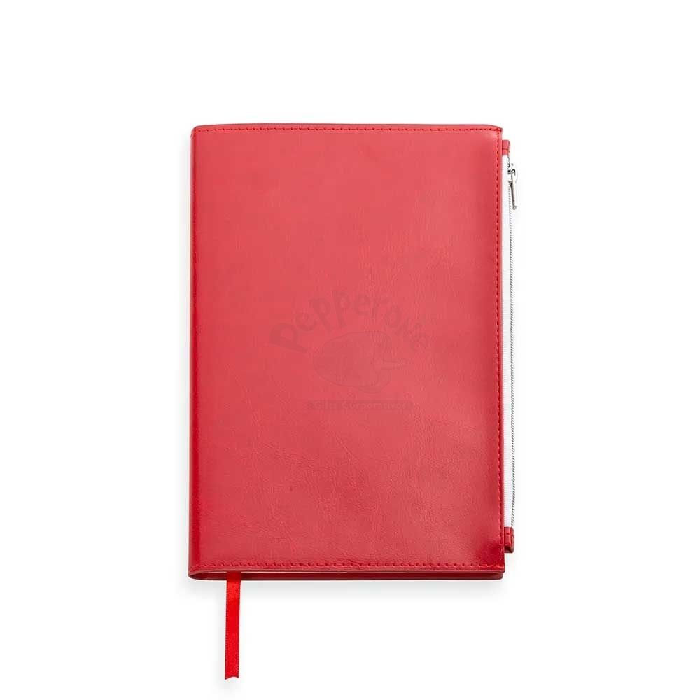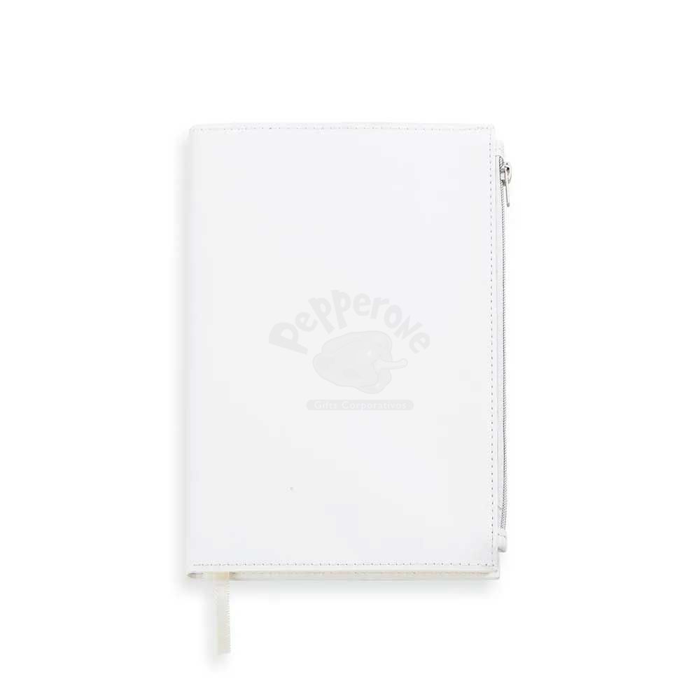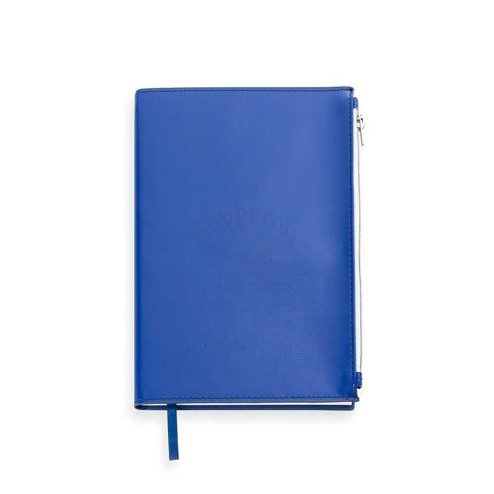 Bloco de anotações personalizado com 80 folhas pautadas, gramatura folha: 90gsm, formato A5, capa em material sintético (similar a couro) e Bolso frontal com zíper para guardar acessórios e objetos pessoais. Ideal para brindes promocionais e eventos corporativos.