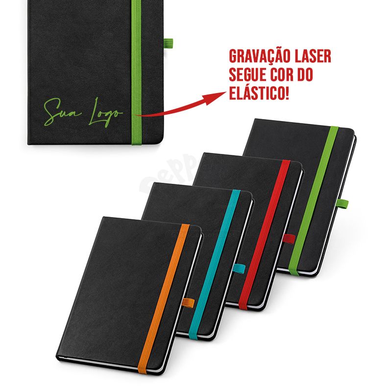 Bloco de anotações personalizado formato A5 com capa rígida em PU. Contém 160 páginas pautadas brancas, suporte para caneta esferográfica (não incluída), bolso interno em papel na parte traseira da capa e elástico para fechamento. Objetos decorativos não acompanham o produto.