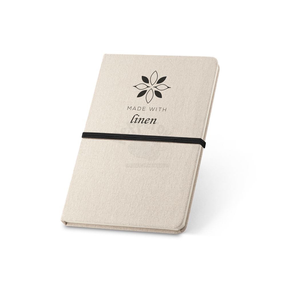 Bloco de anotações personalizado formato A5 com capa rígida Linho 230 g/m². Contém 96 páginas pautadas em cor marfim e cantos arredondados. 140 x 210 mm. Ideal para brindes promocionais e eventos corporativos. Acessórios não acompanham.