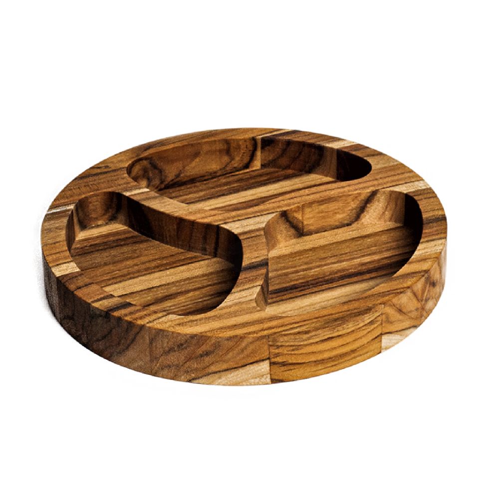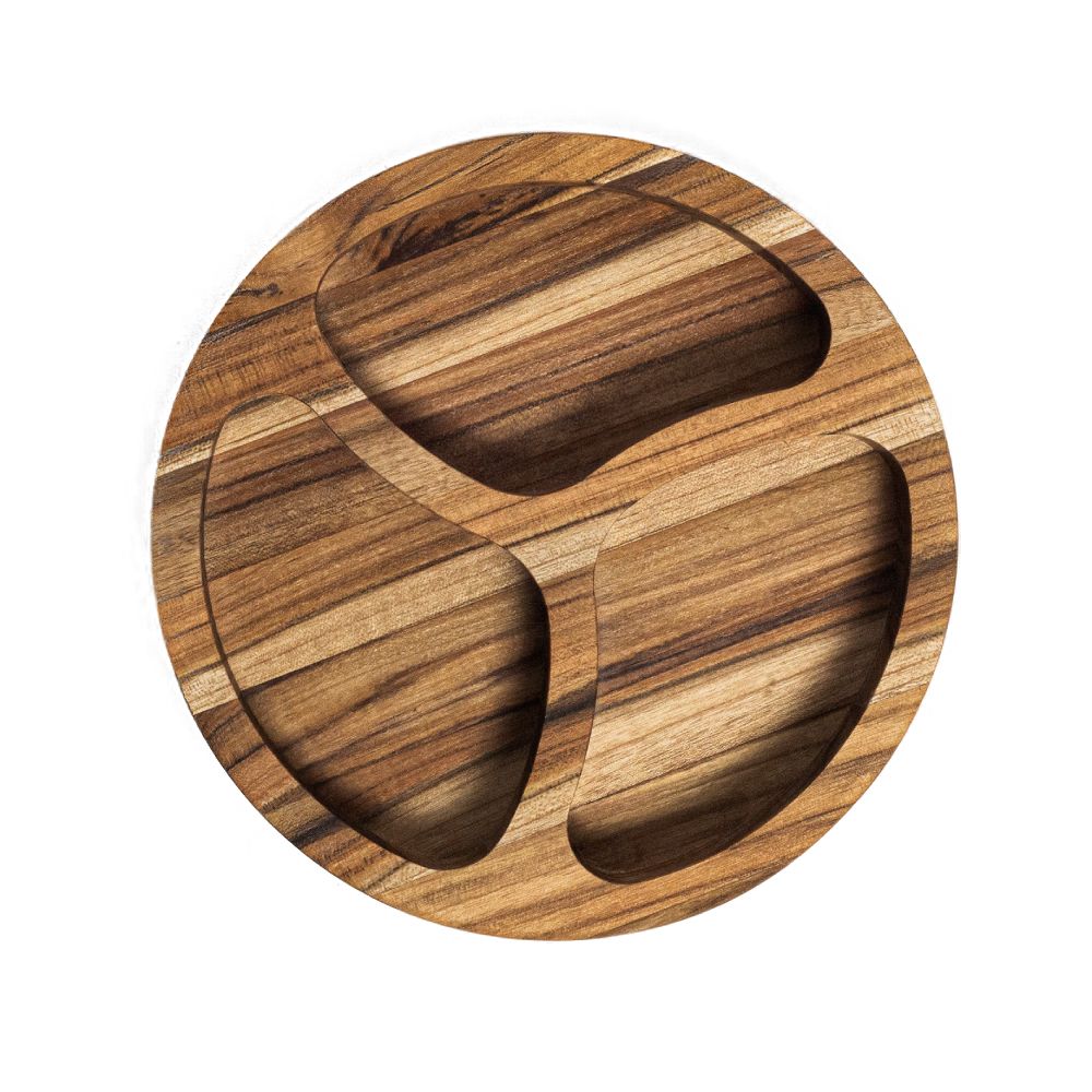 Petisqueira de Madeira com três compartimentos. Design moderno e elegante perfeito para trabalhos culinários de alto padrão. Ideal para brindes em campanhas promocionais, eventos corporativos e feiras gastronômicas.