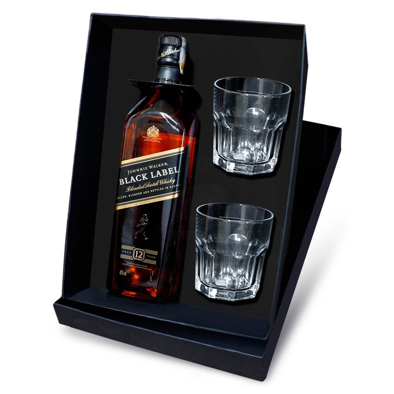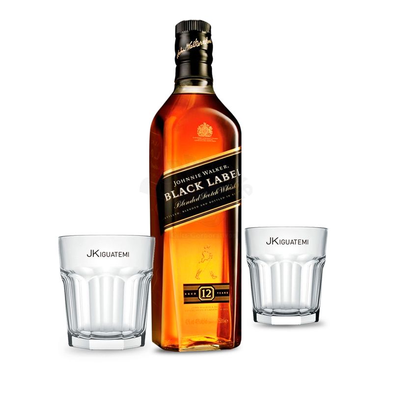 Kit com whisky personalizado com 1 Whisky Johnnie Walker Black Label 1L 12 anos, 2 copos de vidro com capacidade para 320ml cada e embalagem personalizada em papel paraná 80gr revestido de papel color plus. É o presente ideal para presentear colaboradores, fornecedores e clientes em momentos memoráveis.