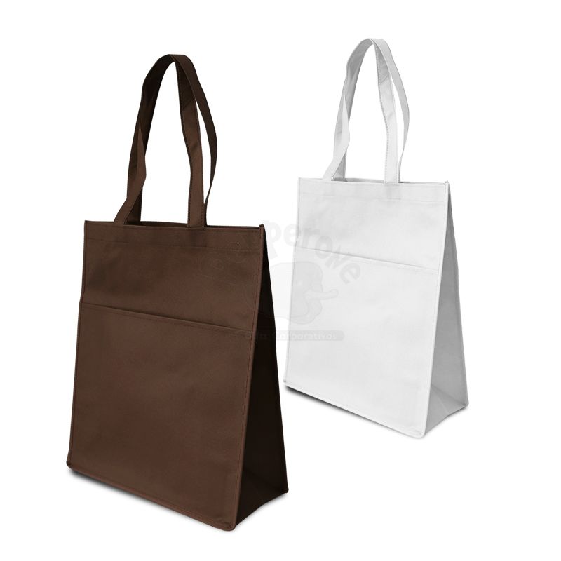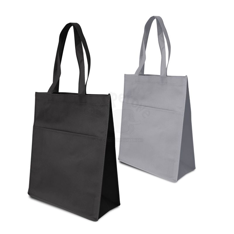 Sacola em TNT personalizada com bolso frontal externo, compartimento principal com amplo espaço interno e alças para transporte (tamanho da alça 25cm). Ideal para brindes promocionais e eventos corporativos.