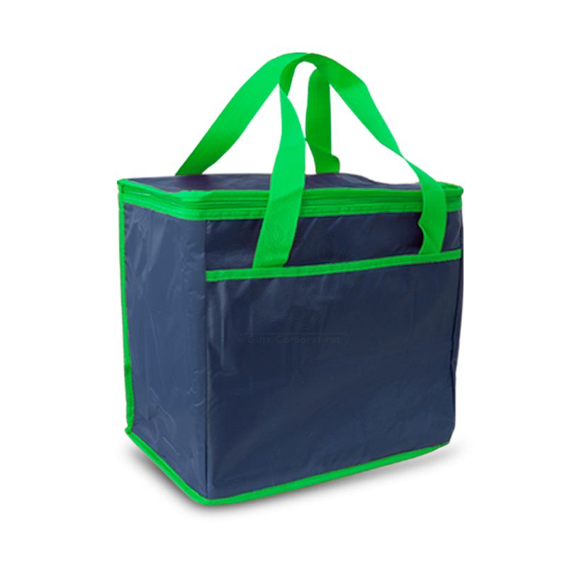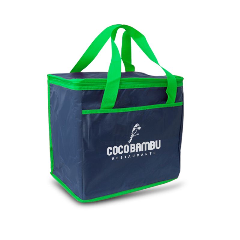 Bolsa térmica personalizada produzida em poliéster 420D com capacidade de 36 litros. Possui área interna com revestimento térmico ideal para manter / conservar a temperatura dos alimentos e bebidas por mais tempo, bolso frontal externo, tampa com fechamento por zíper duplo e alças de mãos para transporte. Ideal para brindes promocionais e eventos corporativos. Imagem ilustrativa.