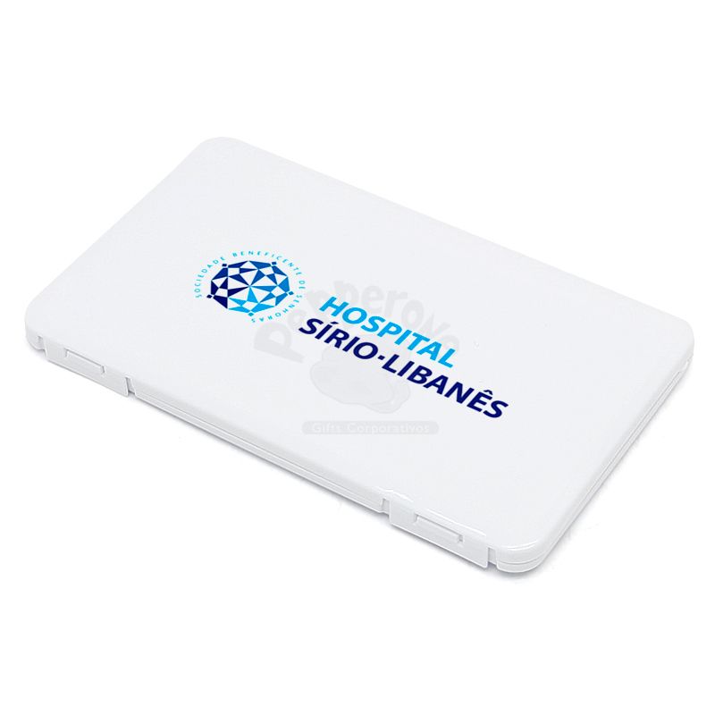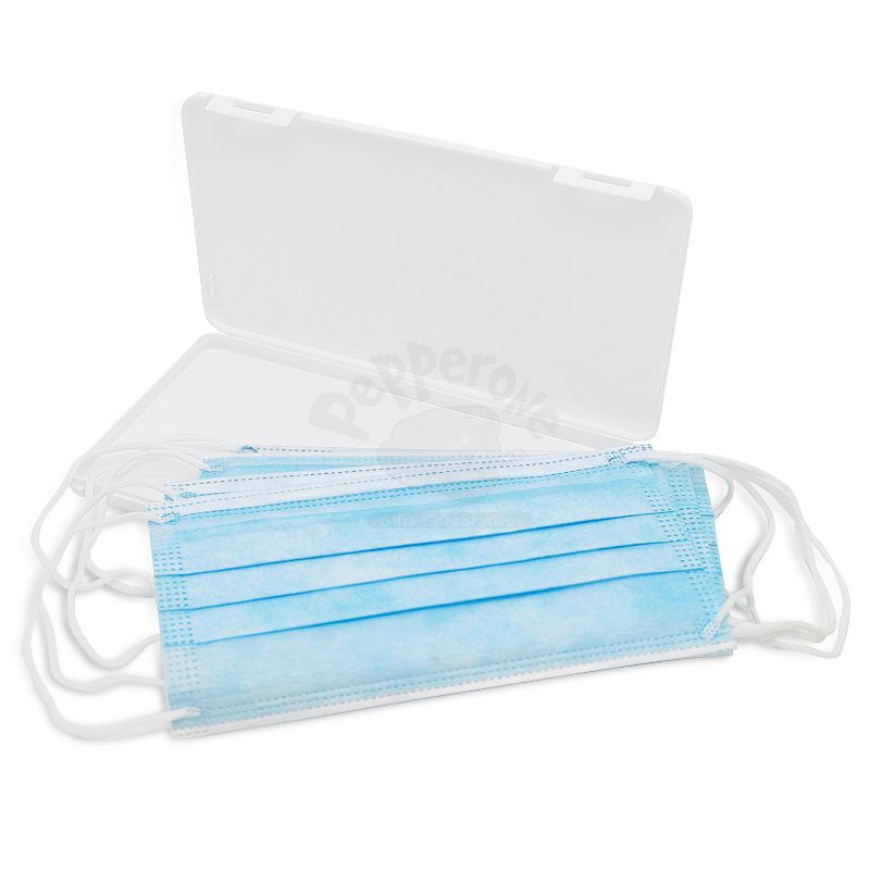 Porta máscara personalizada produzido em plástico BPA FREE com acabamento brilhante. Possui tampa protetora com trava destacáveis e compartimento para 5 máscaras inclusas confeccionada em non-woven / melt-blown non-woven com três camadas que assegurada proteção do meio envolvente das partículas emitidas pelo usuário da máscara através de capacidade de filtragem PFE 90% (recomendação EU: PFE 70%). Respirabilidade > 8l/min e diferencial de pressão < 40 Pa/cm2. Ideal para brindes promocionais e ventos corporativos. Imagem ilustrativa.