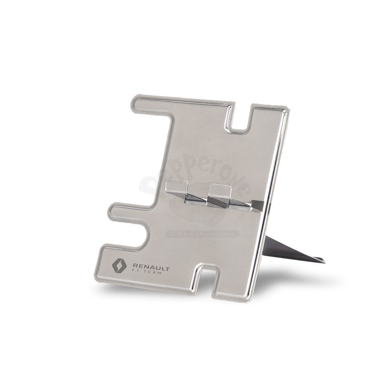 Porta celular personalizado de metal com design diferenciado. Produzido em chapa de metal 0,64mm, Possui base de apoio inferior, compartimento para smartphones de até 17mm de espessura (com capinha) e suporte lateral porta Relógios Smartwatch (não incluso). Ideal para brindes promocionais e eventos corporativos. Gravação a Laser.*Smartphone não incluso ao produto.