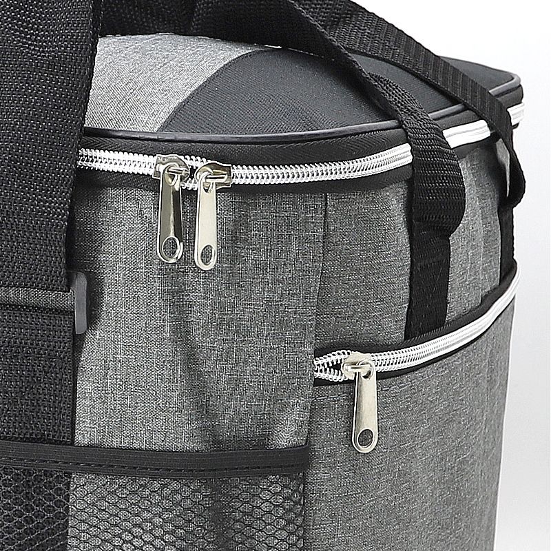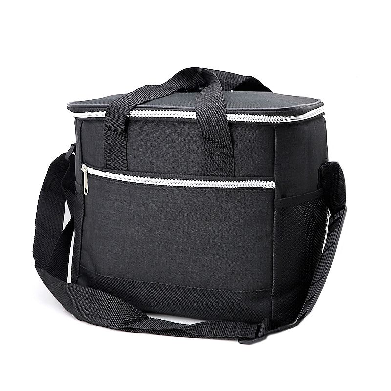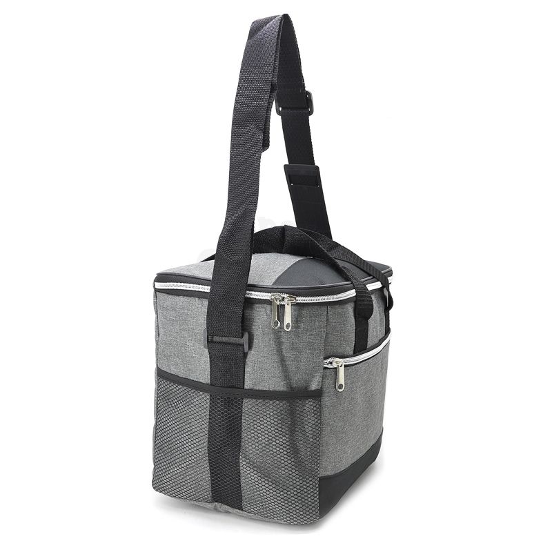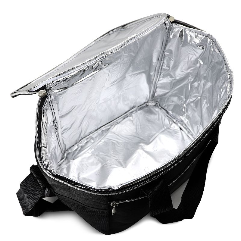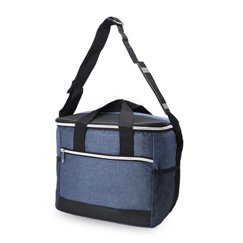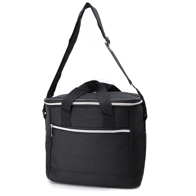 Bolsa térmica 18 litros. Contém bolso frontal com zíper, bolsos laterais telados, alça de mão em nylon e alça transversal regulável (não removível) com apoio para ombro.