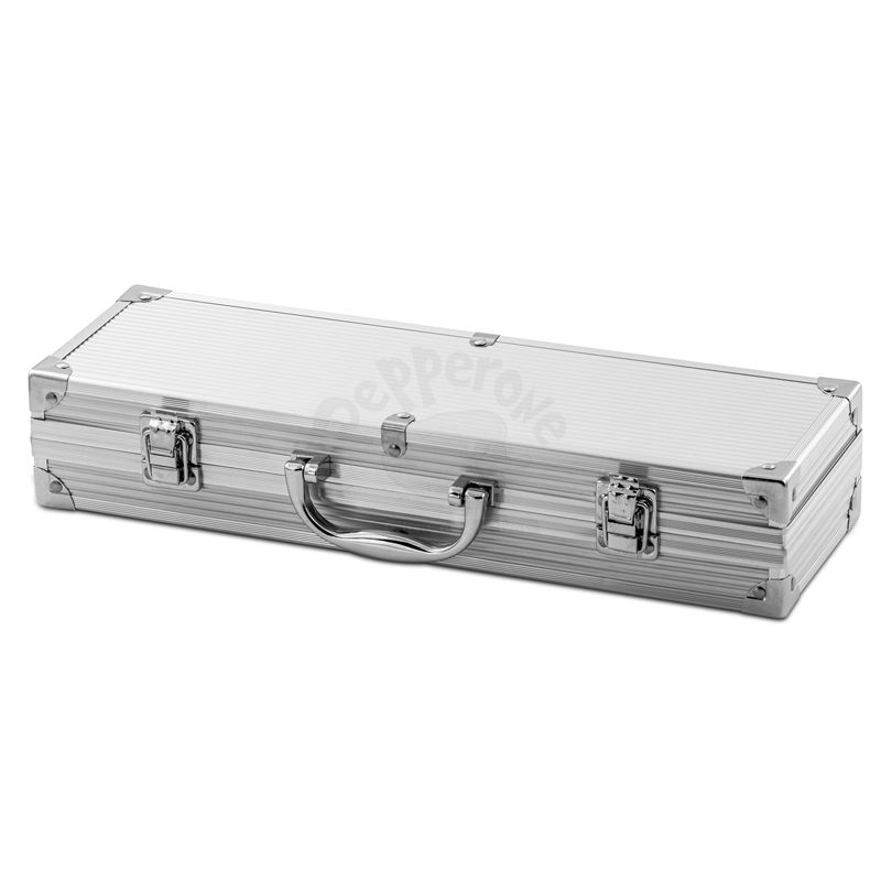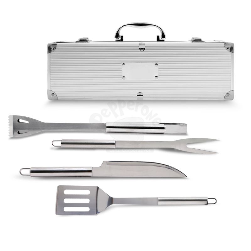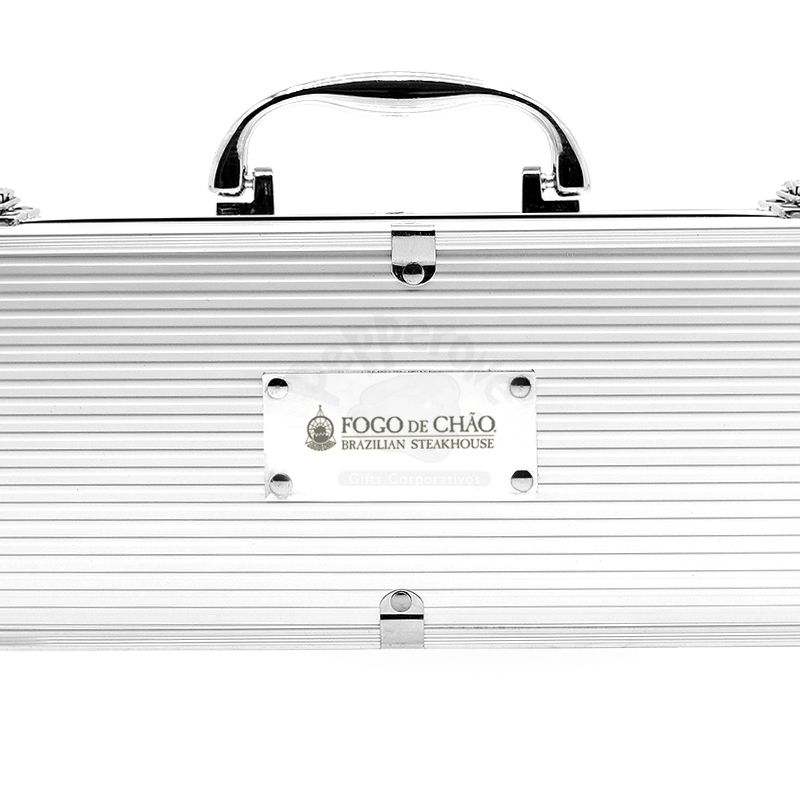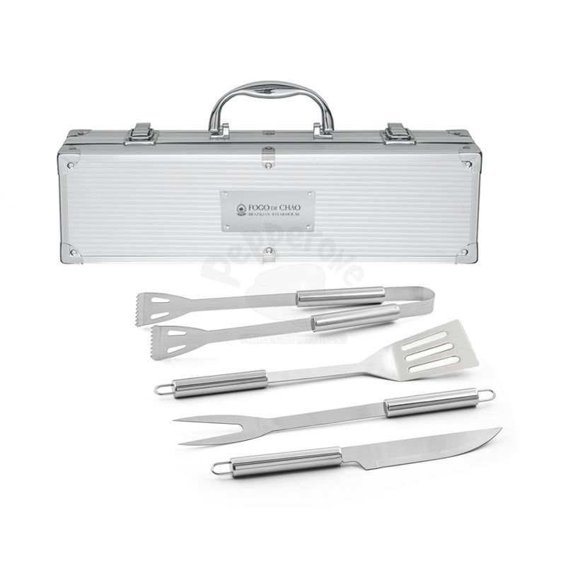 Kit churrasco 4 peças em maleta de alumínio com travas de segurança. Possui 1 espátula, 1 pegador, 1 garfo e 1 faca em inox. Parte interna da maleta com revestimento em Tnt e suportes de velcro para fixação das peças.